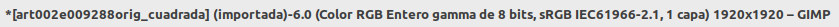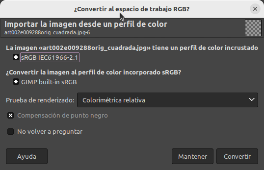 Cuando se abre una imagen jpg como por ejemplo art002e009288orig_cuadrada.jpg GIMP pregunta si deseas convertir el perfil de color de la imagen al espacio de trabajo nativo de GIMP. Generalmente, seleccionar "Mantener" o "Convertir" no afectará drásticamente el resultado si solo vas a realizar ediciones básicas.