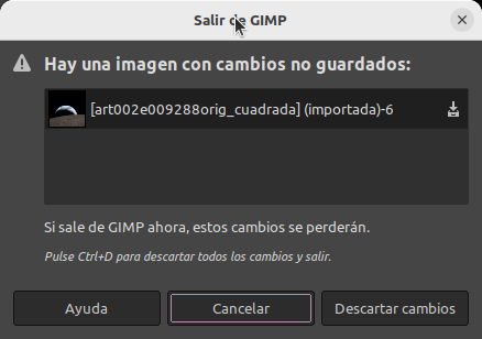 GIMP permite exportar en gran variedad de formatos aunque solamente vamos a ver los implicados en los bloques TFT que son BMP y JPG. El único formato capaz de guardar toda la información de una imagen es el formato nativo XCF. El resto de formatos preserva algunas propiedades pero pierde otras y es imposible que GIMP sepa cual es la información perdida. Por este motivo cuando se cierra una imagen o al cerrar GIMP se muestre el diálogo siguiente:
