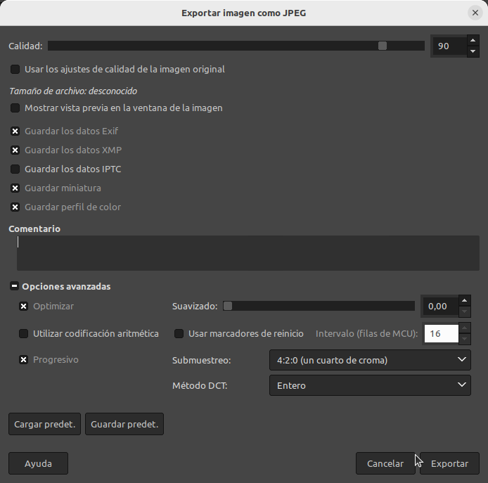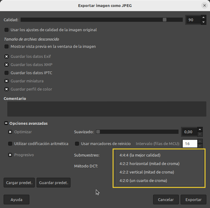 Sin ánimo de entrar en detalles, sobre todo porque el algoritmo JPEG es muy complejo, vamos a ver las opciones disponibles:
