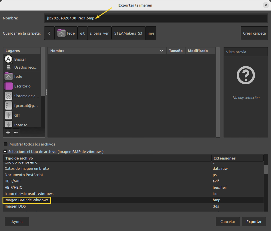 Para exportar una imagen como BMP de Windows en GIMP, ve a Archivo → Exportar como. Asigna un nombre terminado en .bmp o selecciona "Imagen BMP de Windows" en la lista de tipos de archivo, haz clic en "Exportar".