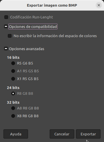 - Codificacion run-lenght: Al exportar como Windows BMP, puedes marcar la casilla para comprimir el archivo. Es especialmente efectivo en imágenes indexadas (con paleta de colores limitada).