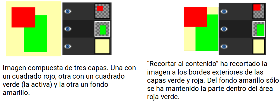 - Recortar al contenido. Elimina los bordes de una imagen buscando en las capas el borde más amplio posible del área del color.