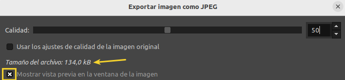 - Mostrar vista previa en la ventana de imagen. Al marcar la opción los cambios se muestran en la pantalla de la imagen sin que se altere la misma. También se se muestra el tamaño aproximado del archivo.