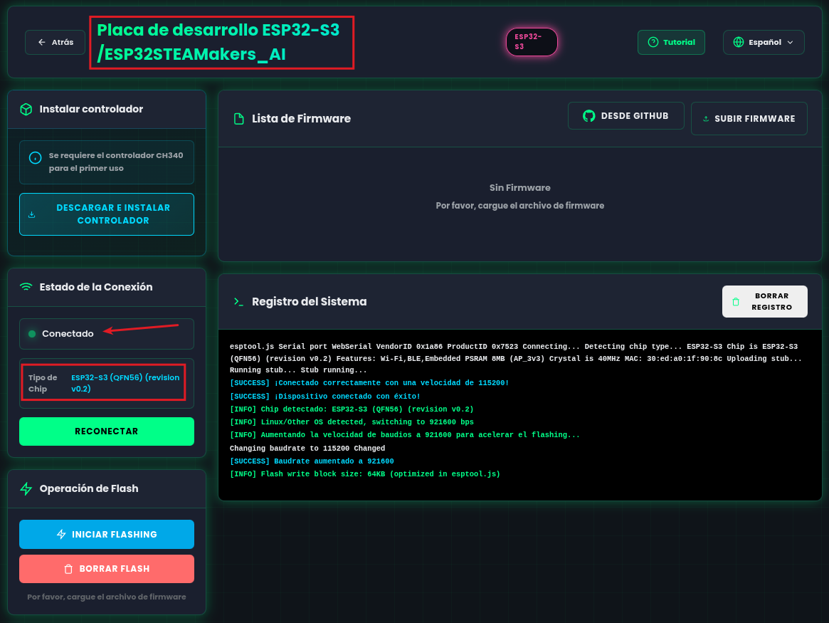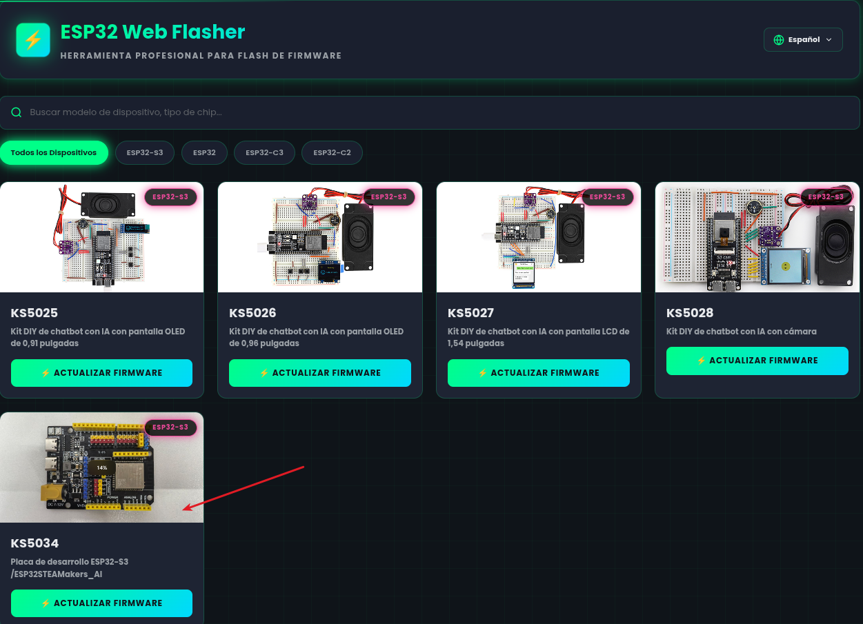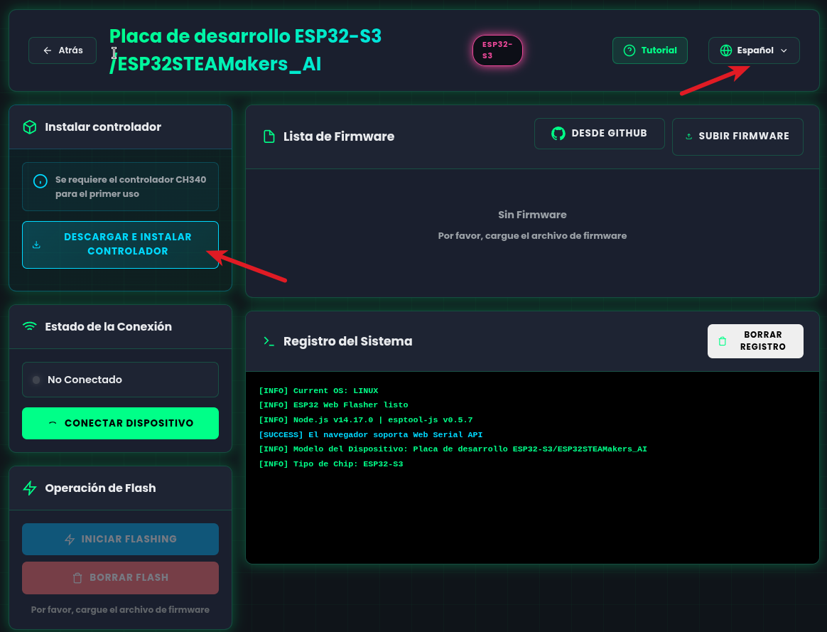 - Accede a la herramienta web de carga de firmware y configurala en español si aún no lo está.