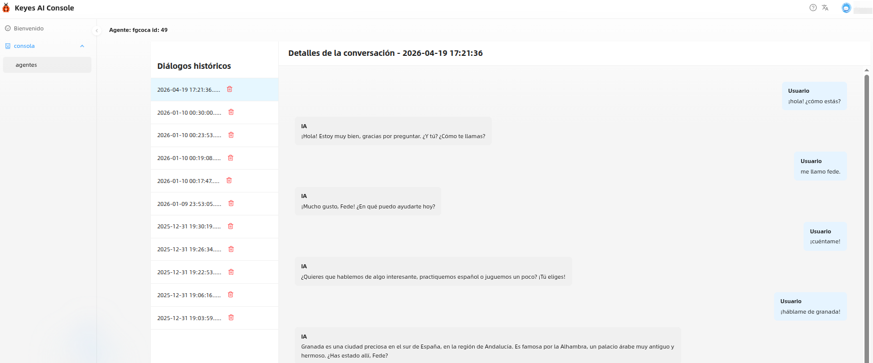El agente mantiene un histórico de los diálogos mantenidos que se pueden ver como texto o borrarlos.
