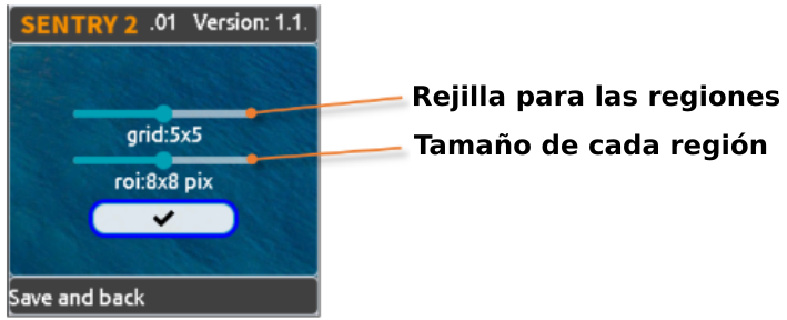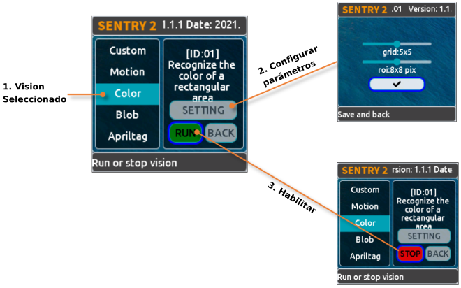 El usuario puede establecer desde una hasta 25 regiones para el reconocimiento de colores y obtener los valores R (rojo), G (verde) y B (azul) y la etiqueta de cada región. Las coordenadas y el tamaño de cada región se pueden configurar.