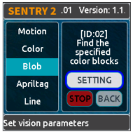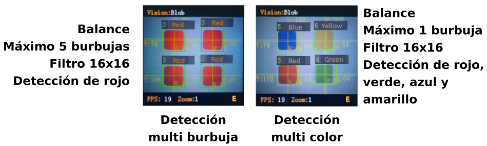 El algoritmo detecta si hay bloques de colores y tamaño especificados en la imagen y devuelve las coordenadas de su centro y el tama ño si se detecta. Los algoritmos Color y Blob tienen las mismas etiquetas de clasificación.