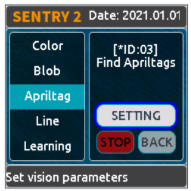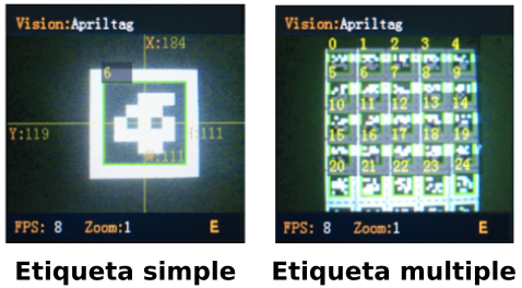 | 3 | Apriltag \(^*\) | Reconoce etiquetas Apriltags en los formatos 16H5, 25H9 o 36H11 (predeterminado: 36H11), hasta 25 etiquetas del mismo formato simultáneamente |