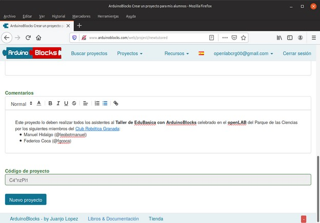 No se inicia un proyecto como tal, sino que se especifican los datos del proyecto y se genera un código para que los alumnos se puedan suscribir al proyecto. El profesor podrá supervisar y valorar los proyectos de sus alumnos.